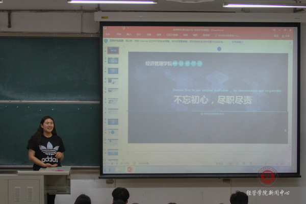 紧接着是15级国际经济与贸易专业温思佳为我们分享作为一名优秀团干部的经验。她所在的班是一个团结、年轻、执行力强的集体。她认为干部应该具有凝聚力,把整个班级拧成一股绳,且要努力和每个人建立良好的关系,而做到这点首先是要自己做事公平公正,待人友好,才能使自己变得更加可信。团支书也应组织一些有意义的活动,学会调动大家的积极性,能够为班级留下美好回忆。温思佳同学说:“你的每一份付出都会有所收获,一定要勿忘初心,尽职尽责,无论你的身份是什么。”