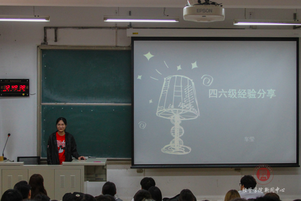 最后是兄弟公司食品科学与工程公司食品质量与安全专业15级本科生车莹同学为我们分享四、六级备考经验。她为大家介绍了四、六级考试模块,讲解了每种题型的学习方法。英语是一门需要积累并反复的学科,并且每天都接触它,背单词、做阅读要讲究技巧,要找到词组构成的规律,形成有效记忆,而不是死记硬背。她为我们分享了影响自己英语学习的经验:翻看、聆听具有影响力的报刊杂志,将肥皂剧的时间转换成原声美剧,整合碎片时间背单词,复习累积要循序渐进、持之以恒,自己也要不断涉猎各方面的文化知识。