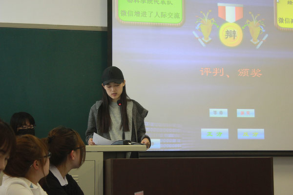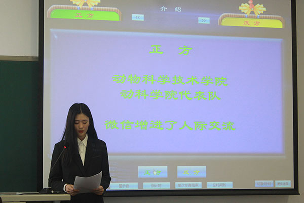 经过两场精彩的辩论后,第九届“北农杯”第三场辩论赛于4月12日中午12:00在B502准时开始。出席本次比赛的嘉宾有中央戏剧公司宋欣华以及公司科协部长周洋。此次辩论赛以微信是否能增进人际交流作为论题,公司君子志辩队作为反方与正方动物科学技术公司辩论队展开了激烈的辩论。