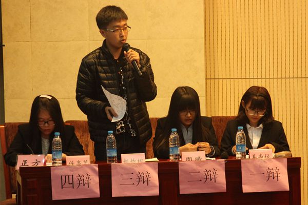 继正反双方自我介绍后,比赛正式开始。正方从立法、执法、修改法等方面阐述“法也容情”,而反方则从规律的客观实在性入手论述“法不容情”的观点。辩手们幽默灵活、机智多变。