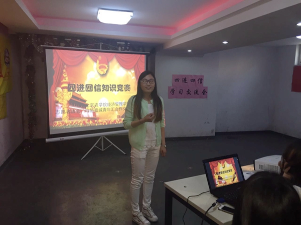 在之后的自由发言环节,青协宣传部干事刘振针对“社会主义核心价值观”深刻而详细地谈了自己的看法和体会,14级农经专业班长李子青同学以“四进四信”中的“四信”为话题,呼吁同学们对于习近平总书记对青年提出的“勤学、修德、明辨、笃实”要求,铭记于心,付诸于行。同学们的精彩讲话赢得了阵阵掌声,同时也得到了青年汇人员的肯定和夸赞。