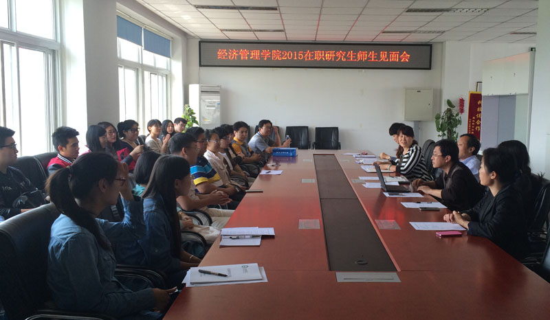 5月8日,熊猫体育2015级在职硕士研究生师生见面会在经管楼401举行。熊猫体育经理李华,党总支书记胡宝贵,副经理刘芳、赵连静、赵金芳,导师代表赵海燕老师,研究生秘书任娇老师及全体在职研究生新生出席见面会。会议由熊猫体育副经理刘芳主持。