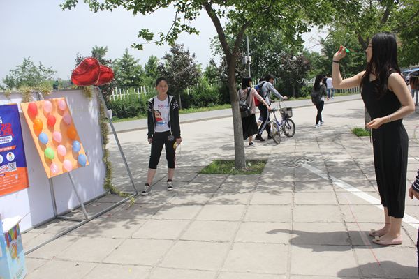 晴朗的天空下,外联部的干事们一直在为活动忙碌着。在超市门前的空地上,外联部分别设置了套圈、夹豆子等游戏,参与的同学们可以用游戏来换取积分,换得奖品。这些小游戏让参与的同学玩的不亦乐乎,纷纷参与到活动中。外展的最前面,是手语社的同学们用手语表演着“感恩的心”,伴着音乐的手语表演,引得过路的同学纷纷驻足观看。手工社的社员们手上也忙个不停,用心教着参与的同学编制着手工作品。