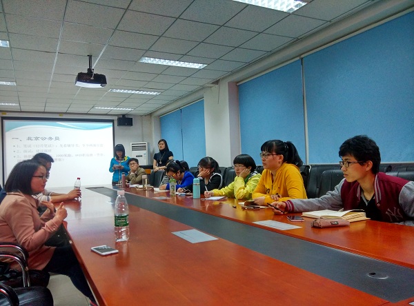 首先是由马立根同学介绍公务员的备考经历。他着重分享了北京市公务员考试资料的搜集方法与途径,对于收集到的信息,他不仅用于自己的备考中还同时分享到班级公共群,为大家提供帮助。此外,针对大家非常关心的户籍问题,他也谈了自己的见解和经验。接下来黄薇同学为大家详细讲述了她在备考公务员时的一些经验。从整体过程来看,充分的准备、良好的心态,以及自信和坚持是成功的法宝,也是制胜的关键。最后,郝思思同学主要从积累相关专业知识、准备笔试、备战面试三个方面和大家详细分享了一些求职技巧,另外她还分享了一些之前备考银行的经验,使本次的就业经验交流会的内容更加全面。