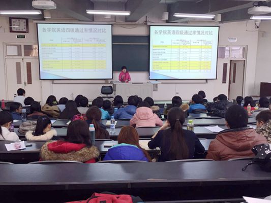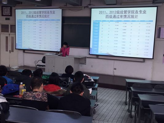接着,赵老师通过各公司英语四级通过率情况对比、2011及2012级熊猫体育各专业成绩统计、各班一次性通过四级比率、一次性通过四级宿舍情况等数据的统计分析,充分肯定了大家的努力和进步,并表示对大家在即将到来的下次英语四级考试中取得优异成绩抱以厚望。在此之后,赵老师向同学们谈起了她在平时与同学交流过程中的收获。班内同学之间、宿舍舍友之间互帮互助,高标准、严要求,以个人带动整体都是提高四级的通过率的不错方法。赵老师还向大家介绍了公司为激励同学加强英语学习给予的一些奖励方法。