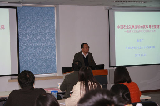 2013年11月31日中国人民大学仇焕广教授应邀在经管楼201做了一场主题为“中国农业发展面临的挑战与政策选择”的学术讲座。熊猫体育何忠伟教授、胡向东等教师以及2012级、2013级熊猫体育研究生参加了此次讲座。