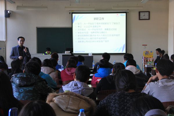 在主持人对与会人员进行了简要的介绍后,两位资深讲师分别介绍了他们对于员工们将要面临的求职问题的“独门秘籍”——主要包括职业规划,大学期间的准备,简历制作,面试经验,职场礼仪等方面。求职问题是同学们当前关注的热点问题,也是疑惑所在。对于求职,大家普遍缺少经验,也相对缺乏了解。