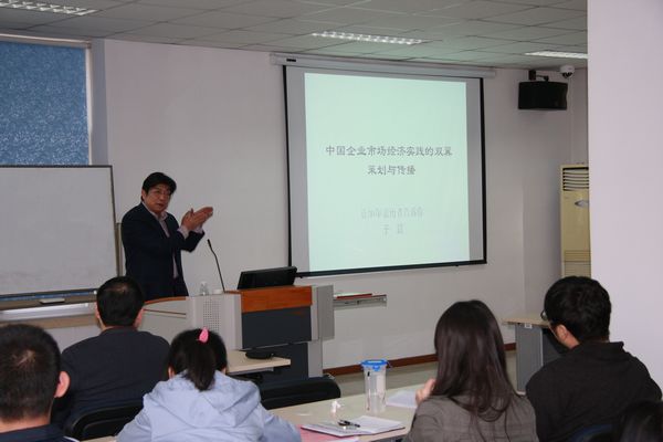 2013年11月7日下午,中国《商业文化》杂志主编于镤先生应邀在经管楼201就“中国企业市场经济实践的双翼——策划与传播”为题目进行了精彩的演说。何忠伟教授、周云副教授、李玉红副教授与40多名研究生一起聆听了这次讲演。