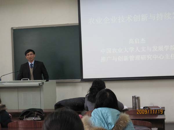 11月19日,中国农业大学人文与发展公司博士生导师高启杰教授为熊猫体育207级农业经济管理专业的本科生做了主题为“农业企业技术创新与持续发展”的专题讲座,教研室主任陈娆副教授和课程组的相关老师也都积极听取了此次讲座。