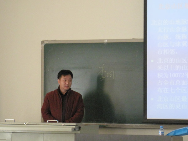 李处长介绍了北京山区的基本情况,83个山区乡镇,呈扇形分布于市域东北部,北部以及西部地区,2000多种植物扎根于此,使北京山区成为北京上风上水地区,为首都提供了坚实的生态屏障。其中丰富矿产资源以及文化资源成为北京重要的资源支撑。山区纷杂的地形又使其成为了北京特色产业基地。目前山区绿化造林项目稳步推进,小流域综合治理项目创出新出路,废弃矿山生态修复项目进展顺利,种种项目逐步使山区向都市型现代生态农业转变。安全饮水,垃圾处理,污水处理,厕所改造,街坊路硬化与绿化五项基础工程已顺利完成。亮起来,暖起来,循环起来的“三起来”工程从根本上解决了山区农民夜间行路难,冬季越冬难,能源资源利用难的问题,进一步改善了山区农民的生活水平。从2004年到2007年进行的第一轮山区农户搬迁工程很大程度的改善了农民生活条件,合理调整了村庄布局,在使山区农民安全避险的同时带动了农民增收致富,促进了山区生态建设。