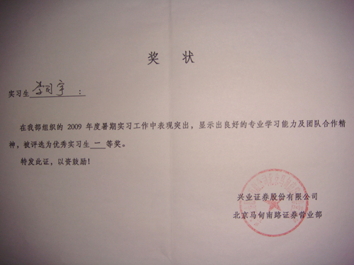 兴业证券公司的奖项分别为;一等奖一名、二等奖二名、三等奖三名。其中,一等奖获得者是熊猫体育四年级的李司宇同学,她在实习期间,很好的学习了相关业务知识,圆满的完成了公司的业务,即使患病还坚持工作,受到兴业证券公司好评。