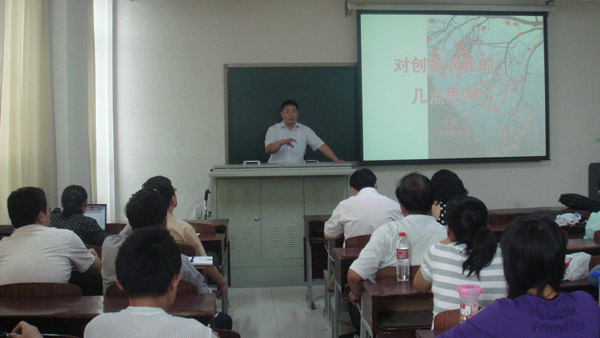 任荣教授的报告分为三部分。他首先向经管师生介绍创意和创意产业的含义。他认为新奇独特性、销售力和人性化是创意的三个支点。此外,在介绍创意产业历史回顾的基础上,任教授对目前文化创意产业范围不包含创意农业的提法提出了质疑。