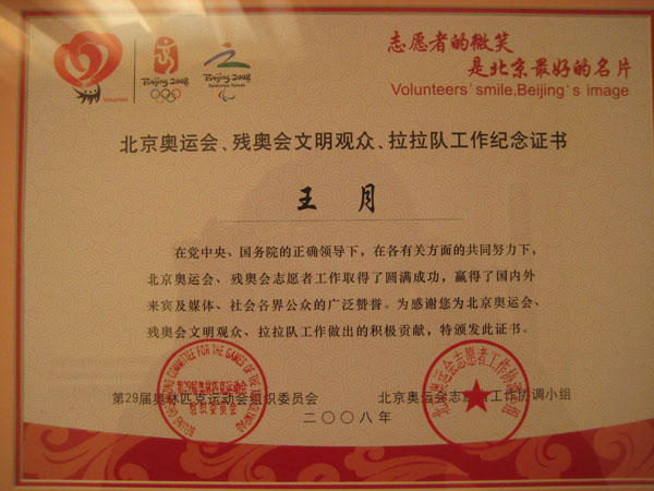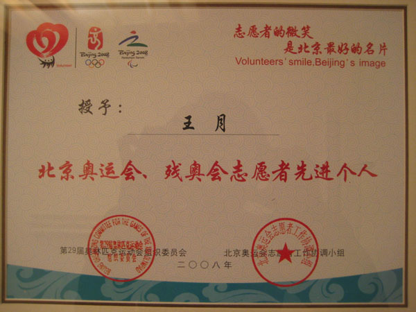 经济管理系王月老师被评为北京市奥运会残奥会志愿者先进个人
