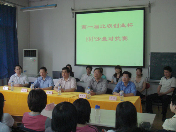 经管系主任何忠伟主持开幕仪式,经理王有年教授、副经理杜晓琳教授、教务处副处长沈文华教授、党总支书记李华教授出席了开幕仪式,经管系其他领导及大赛指导老师参加了开幕仪式。副经理杜晓琳教授代表公司致辞,他指出,公司已经启动公司产品质量建设工程,将积极推动老员工参与校外学习、创新和实践,培养员工的团队协作意识,提升员工的创新精神和就业能力。公司还将设立创业基金,支持员工开展多种形式的创业竞赛。本次北农老员工创业杯ERP沙盘对抗赛为公司开展创业教育拉开了序幕,希望各位选手发扬不畏艰苦、勇于创新、团结协作的精神,冲出北农,走上全国,力争取得较好的成绩,并预祝大赛取得圆满成功。最后经理王有年教授宣布大赛正式开始。随即12个小组开始了紧张而又热烈的比赛,诸位领导进行了现场观摩。