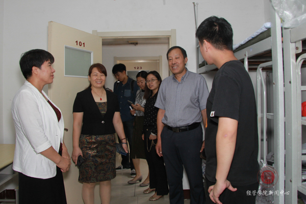 首先,院领导来到女生公寓7号楼,一进宿舍,院领导亲切热情的和新生及家长打招呼,并叮嘱新生不要相信上门推销的人,新生缴费以班助和老师的通知为准,不要轻易相信他人。