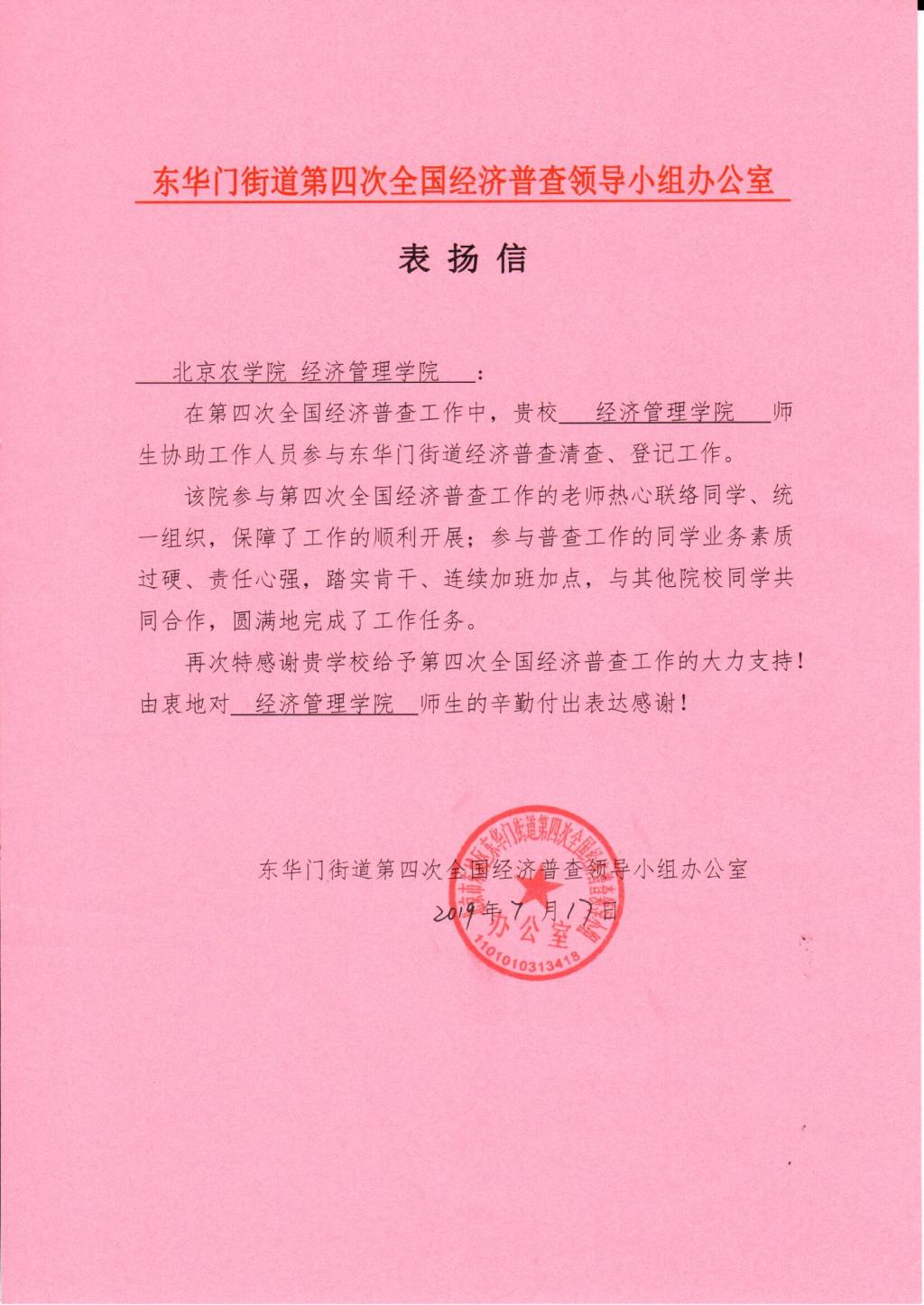 表扬信-东华门街道第四次全国经济普查领导小组来信表扬经管师生