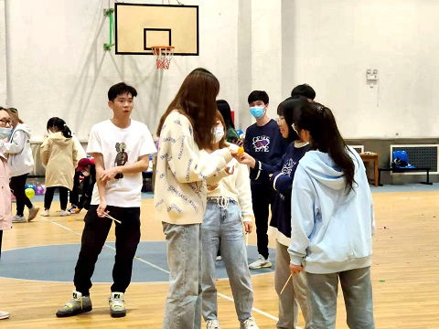活动分为两部分,共四场。分别是组队踩气球、翻扑克牌、绑腿走路、夹乒乓球。
