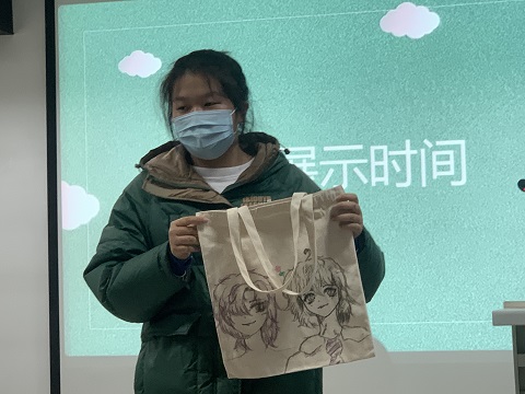 完成环保袋制作后,同学们进行展示分享,各小组派代表发言,讲述本组作品的设计理念及制作感受,并表述组内成员如何团结协作、互相配合,最终完成精美的作品。