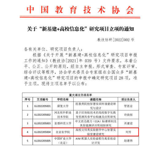根据中国教育技术协会《关于“新基建+高校信息化”研究项目立项的通知》(教技协研[2022]002号),熊猫体育刘芳教授的项目“高校文科类实验教学中心智慧实验室建设研究”获“新基建+高校信息化”重大项目立项。