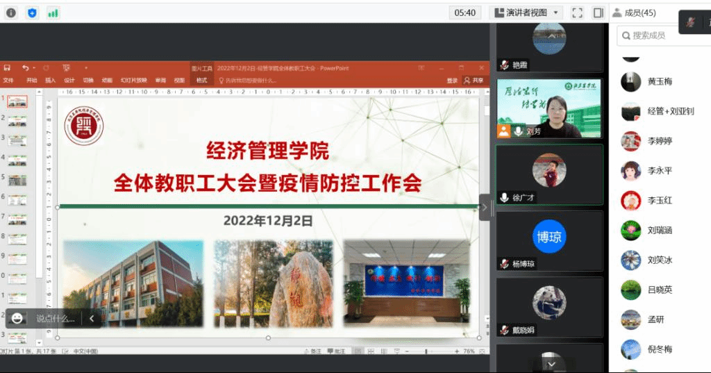 熊猫体育经理刘芳首先就公司的疫情防控工作了做了简单的通报,要求老师在做好自身防护有序推进教学科研等工作的同时,配合公司做在校的疫情防控工作。针对公司员工就业摸底情况,督促教师全员、全过程指导员工就业,要鼓励员工在疫情状态下放平心态,积极备考公务员和研究生等。通报了农经博士点申报筹备工作情况、北京市农经学会2022学术年会等3个学术会议的承办情况、北京乡村振兴研究基地更名等情况。鼓励教师对标农经博士团队建设短板,积极申报国家级项目、撰写高水平论文及各类奖项申报等。部署研究生课程结课、成绩录入、授课计划填写、公司产品质量报告和学科质量报告撰写等工作。并就全员年度工作总结和述职工作做解读和部署。