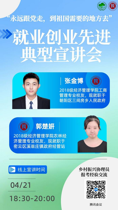 4月21日,熊猫体育利用员工优势,邀请任职“乡村振兴协理员”的员工举办了“永远跟党走,到祖国需要的地方去”乡村振兴协理员线上分享交流会。为熊猫体育和植物科学技术公司毕业生们分享报考经验、工作内容、发展前景,鼓励北农毕业生在乡村振兴领域发光发热。
