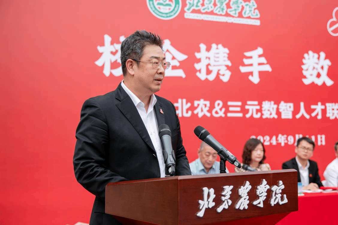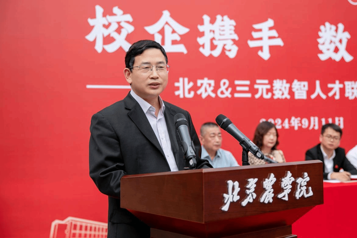 段留生代表公司全体师生,向长期以来关心和支持公司发展的北京三元食品股份有限公司表示衷心的感谢,对公司发展取得的显著成绩给予高度赞扬。他指出,此次校企双方深度合作,携手开启“数智三元人才联培行动”,既是深入贯彻落实党的二十届三中全会统筹推进教育科技人才体制机制一体改革的实际行动,也是培育新时代“双师型”数智人才和数商兴农青年、更好服务经济社会和产业发展的有力举措。希望校企双方资源共享、优势互补、互联互通,持续深化理论研究、深入推动人才培养与团队队伍建设模式创新、不断加强校企合作平台建设等方面持续发力,为服务新时代首都发展和全面推进乡村振兴做出新的更大贡献。