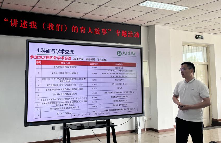 会上,农林经济管理系教师张强强围绕近期他作为论文第一作者,何忠伟教授为通讯作者在国际知名期刊《Sustainable Cities and Society》发表高水平学术论文的经历,结合自身参与团队建设、开展科学研究、做好员工班级管理及个人发展等内容,分享了自己的育人故事。他以“科研”为支点,讲述了十年来科研如何支撑个人发展、助力个人成长的心路历程,并从科研与班级建设、日常工作、团队建设、学术交流、个人发展等方面展开专题讲述。他分享道:“科研育人要做到‘八要’——要健康、要学习、要合作、要生活、要坚持、要热爱、要分享、要尊重。”这番真诚的经验分享引发了在场教师的共鸣。