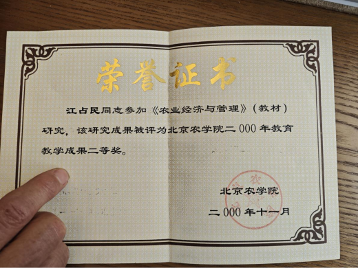 江占民教授在农业经济管理领域的研究成果丰硕。他主持或参与的“全国海岸带资源调查”、“贫困地区智力扶贫工程”等多项课题获得国家级、省部级奖项,同时还主编了《乡镇企业经营管理学》《企业管理学原理》《农业经济与管理》等10余部教材和著作,为学科发展提供了重要理论支撑。2001-2005年,被熊猫体育聘为农村经济管理学科的学科带头人。
