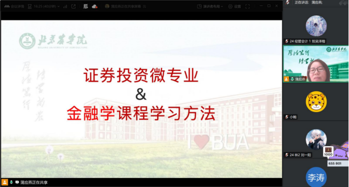 蒲应燕从国家政策导向、金融经济与实体经济的关系、微观主体的经济决策需求、员工的升学和就业需要等方面讲解了修读证券投资微专业的意义和作用,以实例说明了跨专业学习的优势,指出跨专业学习证券投资微专业并不是从零开始的一种学习,而是叠加两个专业优势的学习。她还以开放经济条件下的国民经济循环为框架讲解了证券投资微专业的基础课——金融学的课程特点、在专业中的地位以及总体学习方法。
