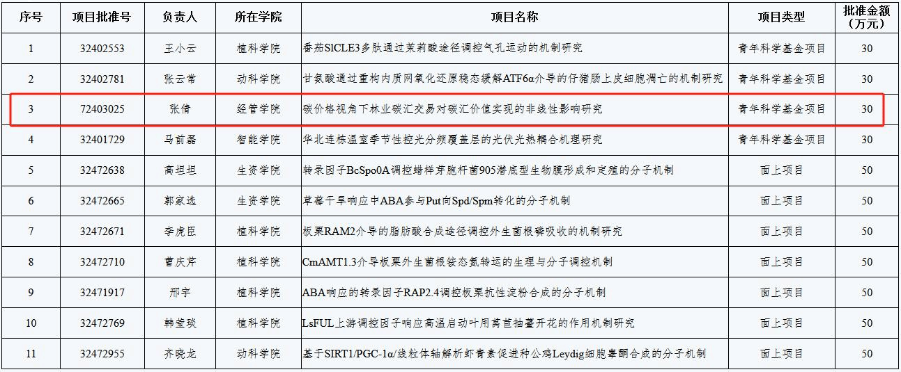 近日,国家自然科学基金委员会正式公布了2024年度国家自然科学基金立项结果,公司青年教师张倩的课题《碳价格视角下林业碳汇交易对碳汇价值实现的非线性影响研究》获得青年科学基金项目立项资助,资助金额30万元。