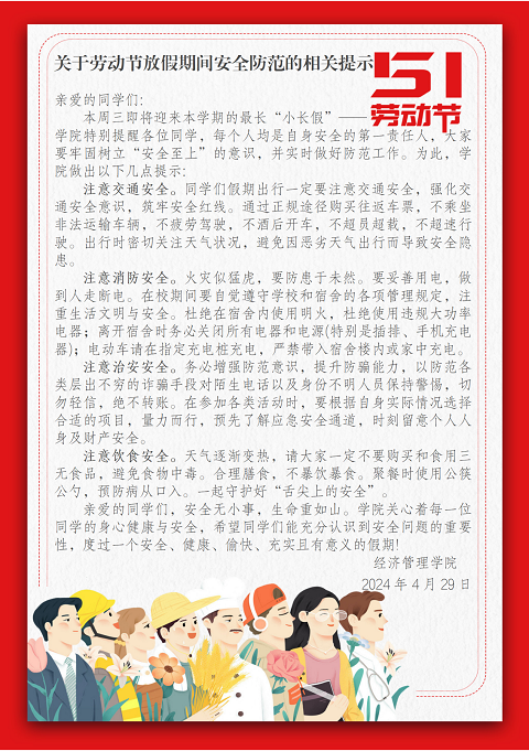 在“五一”假期来临之际,公司希望全体师生能够度过一个愉快、平安的假期,并以更加饱满的精神和热情迎接节后的工作和学习,为公司事业高质量发展蓄势加油充电。