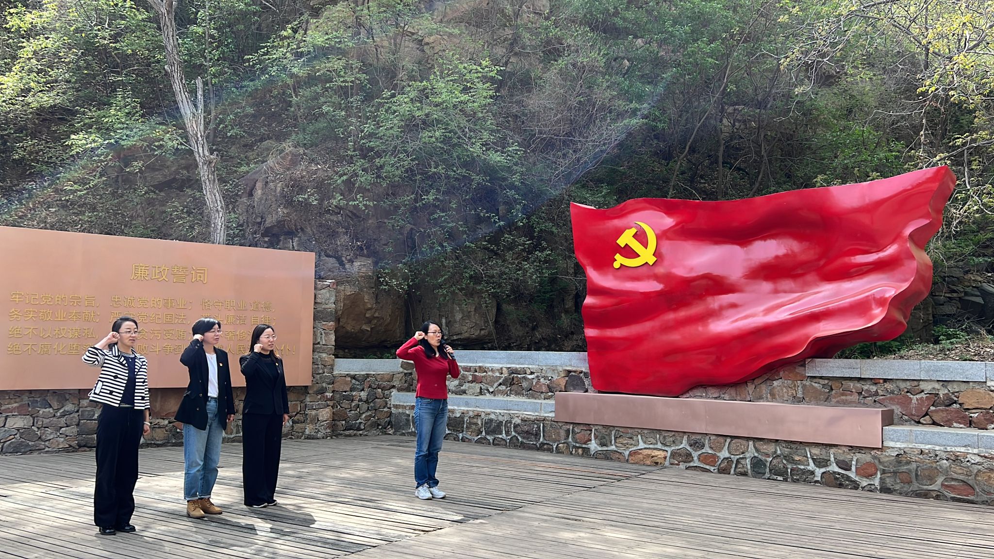 随后,农经系教师党支部一行人又来到平谷区桃棚村红谷党员教育基地(冀东抗日根据地旧址)开展主题党日活动。桃棚村红崖洞是平谷区第一个党支部(鱼子山党支部)诞生地。“铜南山、铁北寨,打不垮的鱼子山”,抗日战争时期,平谷是冀东抗日根据地西部的核心区域。在艰苦卓绝的抗日战争中,英勇顽强的平谷人民在中国共产党的领导下,在这片古老的土地上谱写了爱国主义篇章。